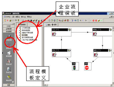 在Javelin的"系統管理"工具條中有一個流程模板定義入口,在這里你可以創建企業的各種各樣的流程模板,見下圖所示:
