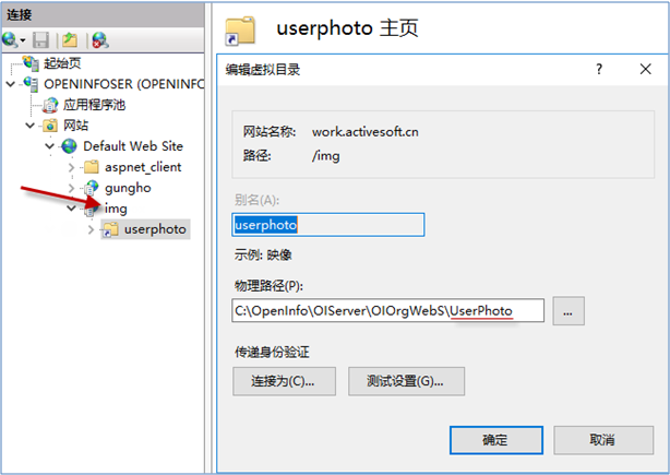 第三步:在img應(yīng)用下面創(chuàng)建虛擬目錄 userphoto (固定不能改),地址指向org 服務(wù)下 userPhoto目錄