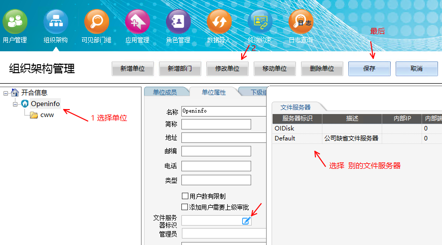 系統設置默認文件服務器后,一般情況下,所有文件上傳都采用這個文件服務器,但也有特殊的需要,比如某一個單位的,要采用另外的文件服務器(參考下圖)