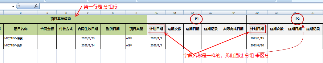 在P1 下面有 計(jì)劃日期;在P2下面也有 計(jì)劃日期 ,2個(gè)字段名稱是一樣的。我們做讀取數(shù)據(jù)的時(shí)候必須要依賴分組 P1、P2的定義才能區(qū)分